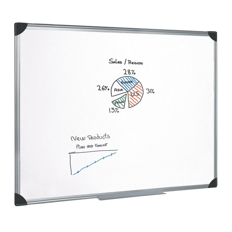 5 Star Aluminium Magnetic Drywipe Board. Magnetic whiteboards generally have a higher grade surface of whiteboard and are ideal for the heavy user. Recommended for use in training and meeting rooms they also have the added advantage of doubling up as a noticeboard, as magnets can be used to attach messages or charts. All boards come complete with a pen tray and wall fixing kit. For optimum performance all magnetic whiteboards should be cleaned with a specialist board cleaning product. Lightweight, magnetic lacquered steel drywipe surface with aluminium trim. Simple wall fixing method concealed by colour co-ordinated corner caps. Includes wall fixing kit and pen tray (markers not included, available separately). WxH: 1800x1200mm (6ftx4ft).