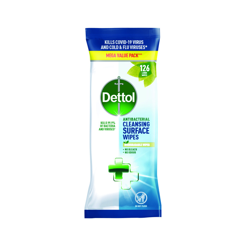 Made from biodegradable fibres, these Dettol Antibacterial cleansing surface wipes are tough on germs and allergens, killing 99.9% of bacteria and viruses. These 100% plant based wipes are free from bleach and odour. There are 126 large wipes per pack.