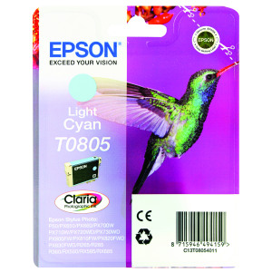 Choose a genuine Epson T0805 Light Cyan Inkjet Cartridge for outstanding print output from your Epson Stylus printer. This cartridge is packed with high quality Epson Claria ink for even more vibrant photos, giving you superb results across anything from business documents to school reports, posters to photo prints. Each cartridge contains 7.4ml of light cyan ink, with a print yield of up to 350 pages.