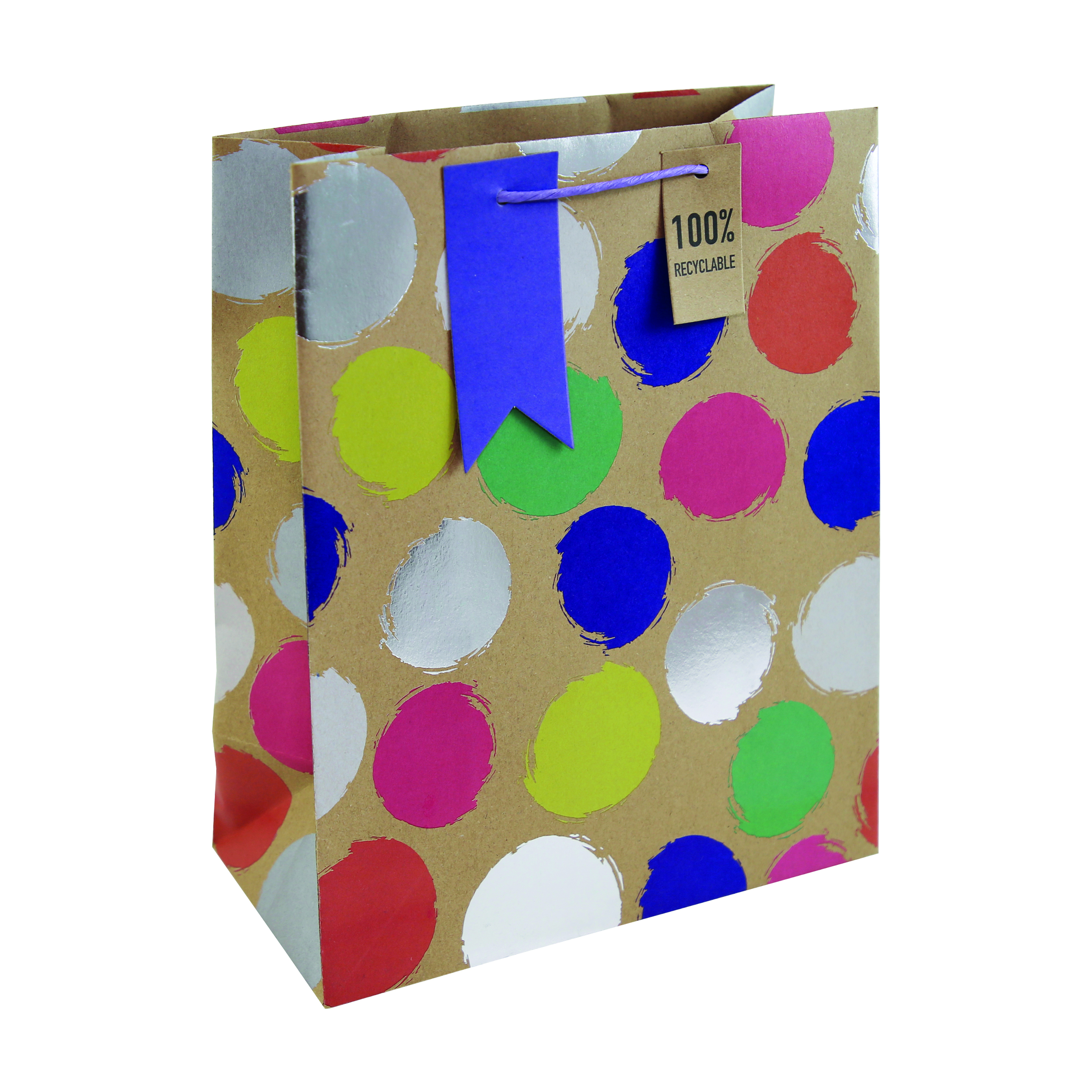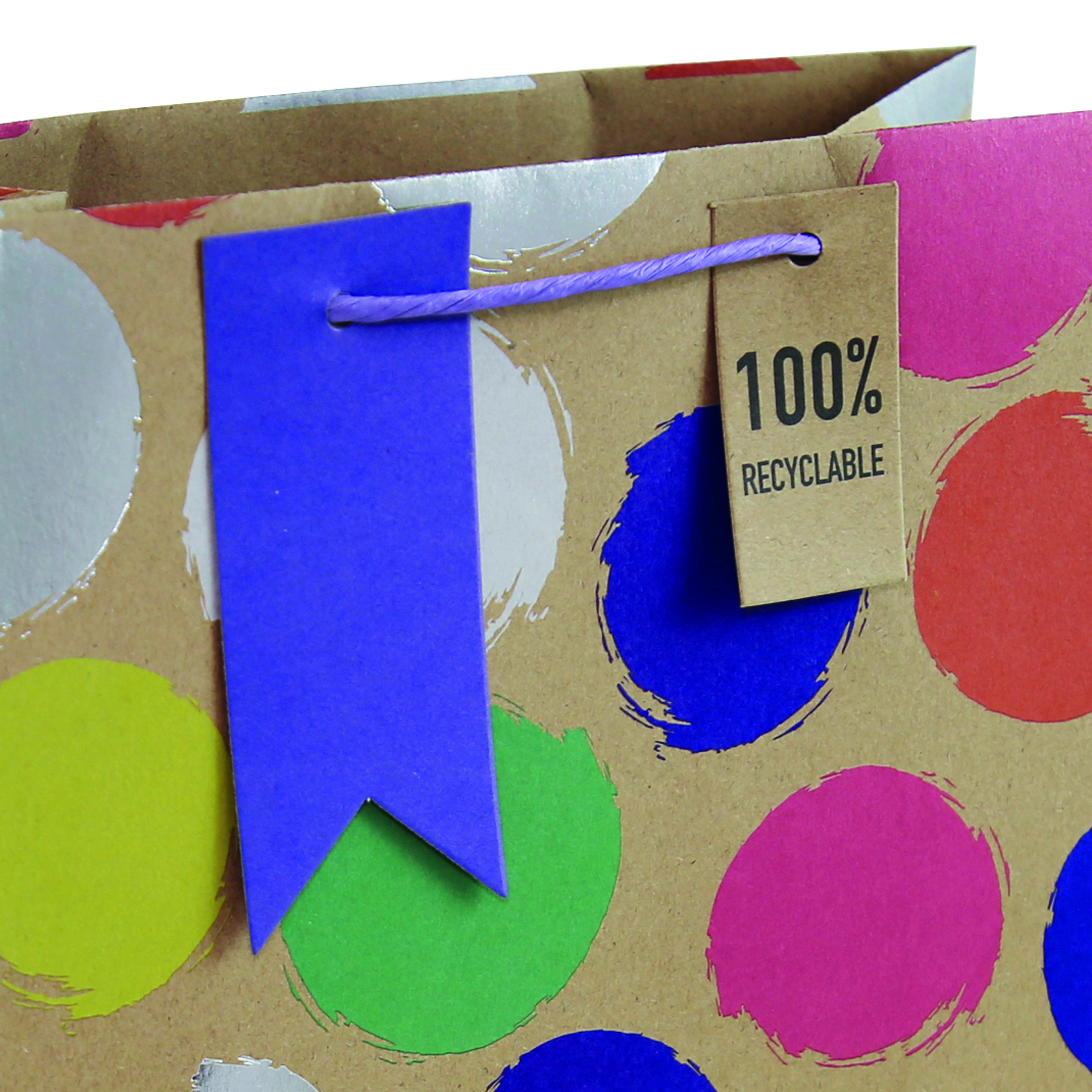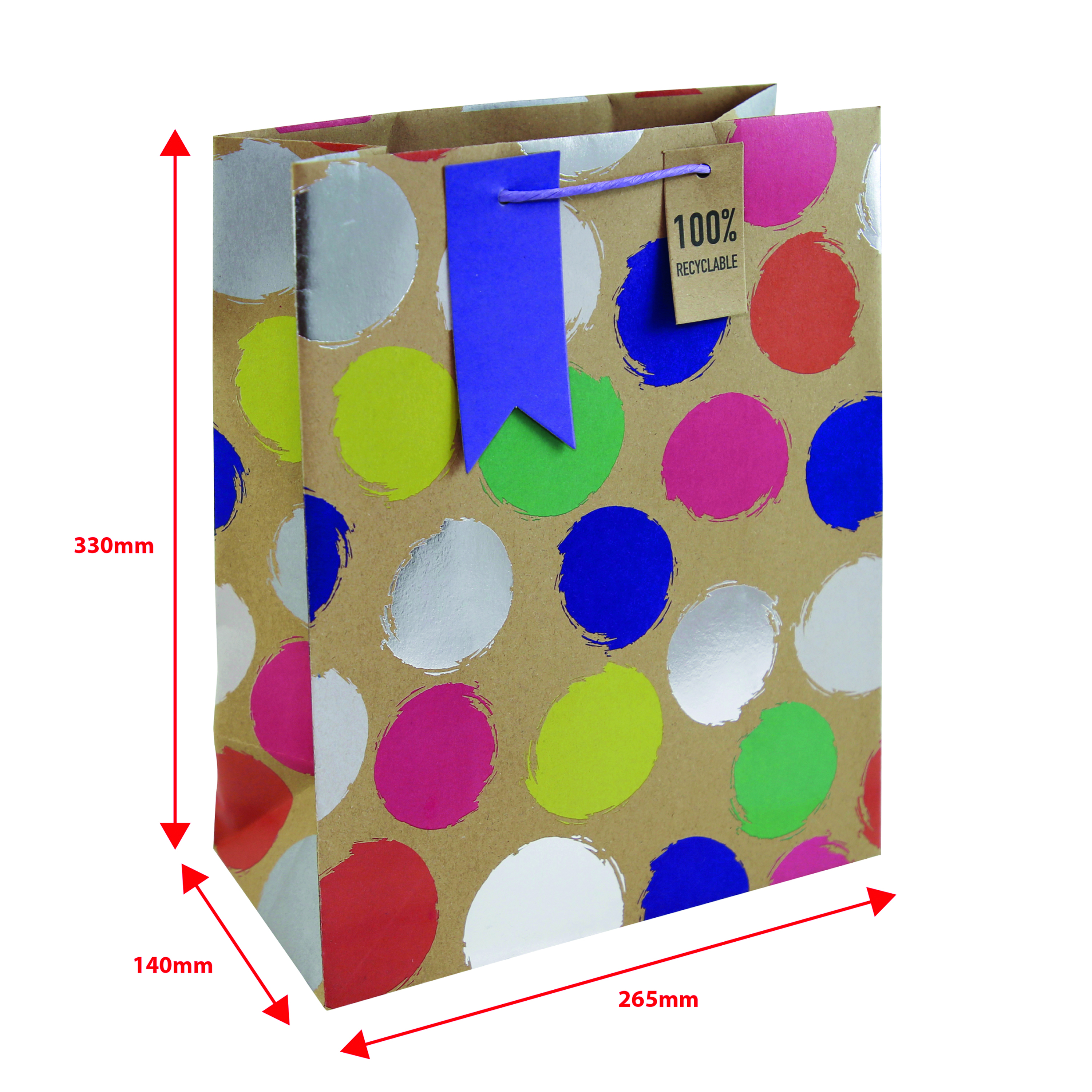 Introducing the vibrant polka dot, large, gift bag, the perfect combination of style and sustainability. Crafted from 210gsm high-quality paper, this large gift bag offers durability and a premium feel. The foil finish adds a touch of elegance, making it ideal for any special occasion. Made from 100% recyclable materials, it is designed with both the environment and gifting needs in mind. Supplied in a pack of 6.
