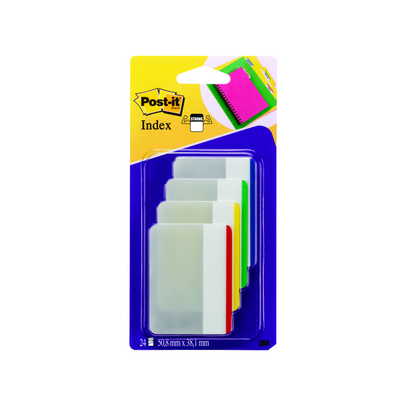 These Post-it Index Flat Filing Tabs provide an easy way to mark and highlight important information in an instant. With Post-it removable adhesive, you can easily apply, remove and readjust the index tabs as necessary, whether you're highlighting parts of a document or marking relevant pages in a book. The extra large tabs measure 50.6 x 38mm (2 x 1.5 inch), providing a larger area to write on. The durable, extra thick tabs are designed for long lasting use. This pack contains 24 index tabs with blue, yellow, red and green coloured tips.