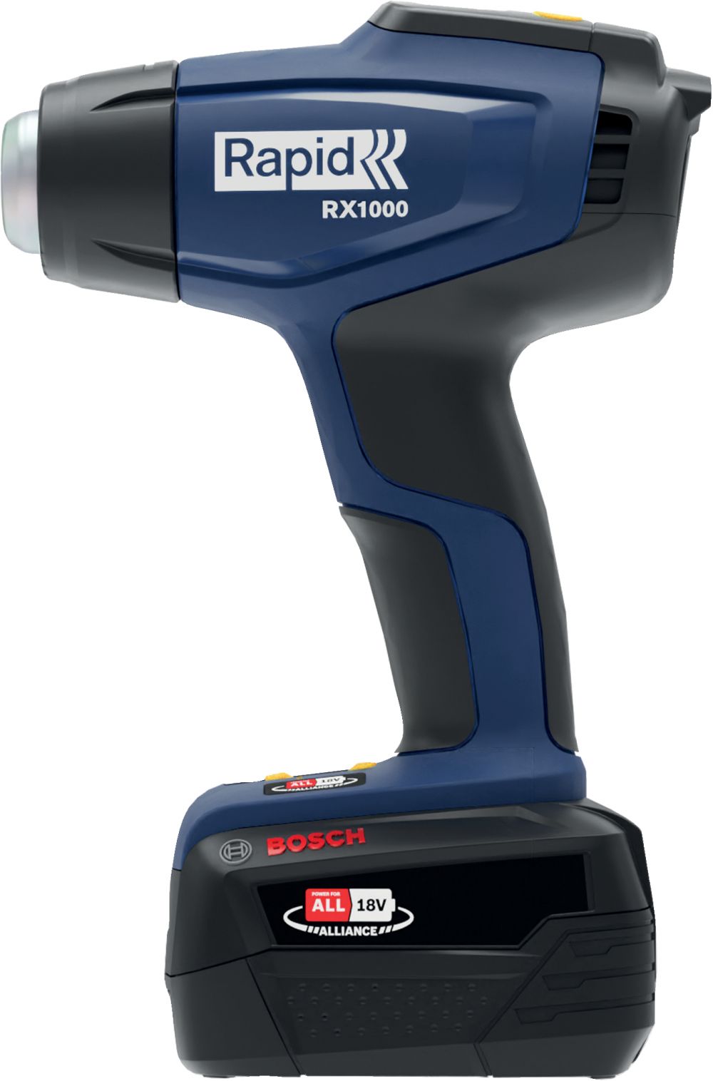 A cordless hot air gun is of great use to you in the home for heat shrinking tubes, shaping plastic, thawing water pipes, removing labels, waxing snowboards and skis, or why not for removing weeds. Rapid’s RX1000 heat gun quickly reaches up to 550°C, which covers most project requirements. A clear LCD screen for regulating the temperature and air flow also displays the battery’s charge status. A unique feature to easily remove hot nozzles without getting burned provides added safety. Two air flow settings means you can work flexibly. With a stable free-standing position, you always have both hands free to work. Rapid RX1000 is part of Bosch’s battery partnership, POWER FOR ALL ALLIANCE. So you can use the same battery with Rapid’s 18V products as with a number of products from brands like Bosch, Gardena, Gloria and Wagner. We recommend the P4A 4.0 Ah battery, which gives up to 22 minutes of operating time. Battery and charger not included, but sold separately.