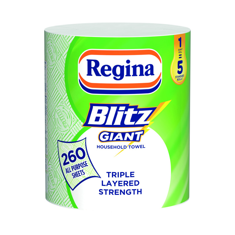Regina Blitz Giant household towels on a large single roll. Ideal for use when cleaning, mopping, dusting and DIY tasks. Made from pure cellulose, these 3-ply all purpose sheets will clean spills, much and grime, both indoors and outdoors. These compact sheets efficiently tackle even the messiest jobs with minimum waste. 260 sheets per roll. Sourced from materials obtained from responsibly managed forests and controlled sources. Supplied in a recyclable paper packet.